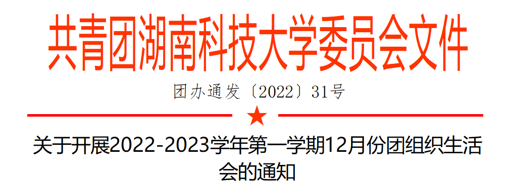 为进一步提升团的组织力、引领力和服务力,夯实基层基础,增强基层团支部的组织活力,根据《共青团中央印发<关于加强新时代团的基层建设着力提升团的组织力的意见>的通知》《共青团中央关于印发<中国共产主义青年团基层组织“三会两制一课”实施细则(试行)>的通知》等文件有关要求,现将2022年12月份主题团组织生活会的具体通知如下: