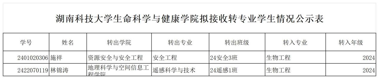根据《湖南科技大学普通全日制本科生转专业管理办法(试行)》(科大政发〔2024〕81号)和《成年人免费视频转专业管理办法》(院发〔2024〕38号)等文件精神,经学生本人申请、转专业工作领导小组面试、教务办审查,拟同意施祥、林锦涛2名同学由外院转入我院生物工程专业学习。现将转专业名单进行公示。