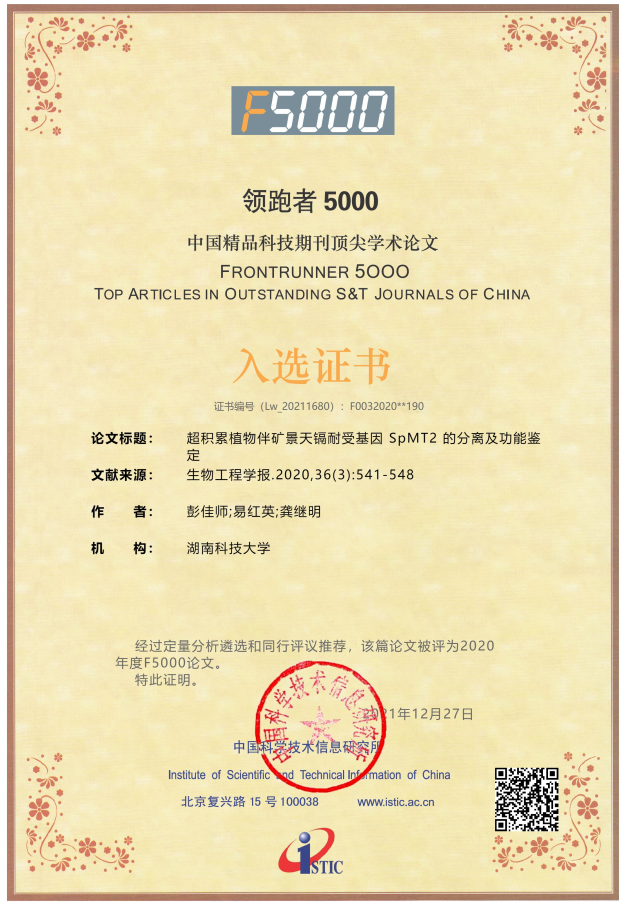 近日,国家科技部中国科学技术信息研究所公布了2020年度“领跑者5000—中国精品科技期刊顶尖学术论文(F5000)”入选名单。经定量分析遴选和同行评议推荐,我校成年人免费视频彭佳师博士完成的论文“超积累植物伴矿景天镉耐受基因 SpMT2 的分离及功能鉴定”入选,该论文发表在2020年度的《生物工程学报》(第36卷第3期)上。