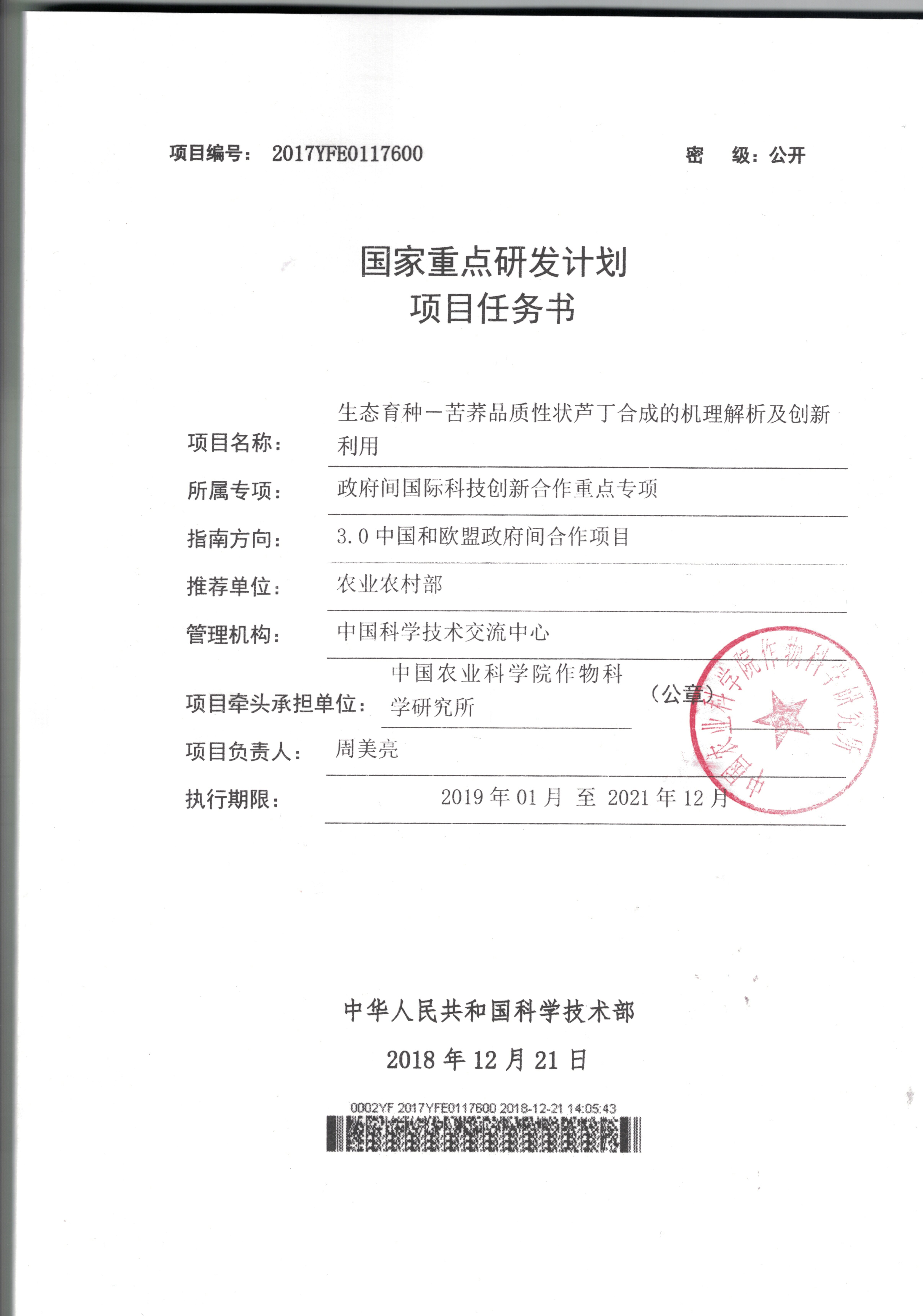 近日从科技部获悉,由中国农业科学院作物科学研究所周美亮研究员主持申报的中欧政府间国际科技创新合作重点专项“生态育种-苦荞品质性状芦丁合成的机理解析及创新利用”项目获科技部立项资助(2017YFE0117600)。