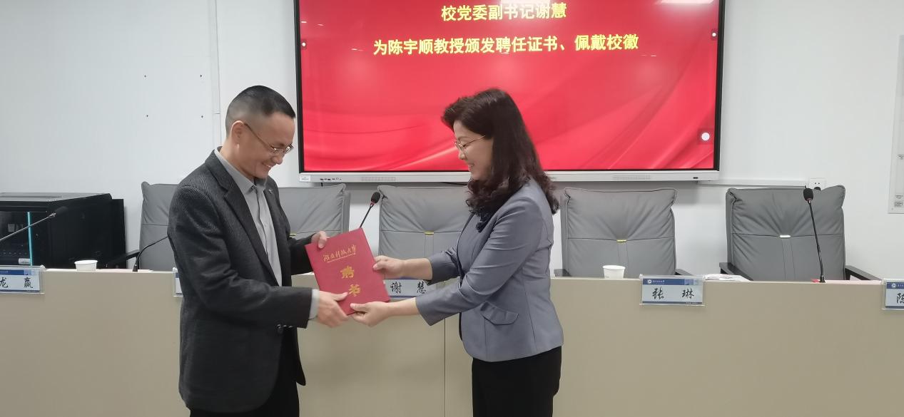校党委副书记谢慧为特聘院长陈宇顺教授颁发聘任证书、佩戴校徽并发表讲话。谢慧副书记要求,一是要抓学习,希望领导班子带领全院师生抓好政治学习和业务学习,提高政治站位和业务能力,不断夯实学院发展基础;二是要抓规划,要立足国家战略和区域经济社会发展以及自身实际,科学谋划好学科发展,不断凝聚学科特色,制定好学科发展目标;三是要抓队伍,要加强领导班子和人才队伍建设,团结一致,形成合力,守正创新,实现学院的跨越式发展。